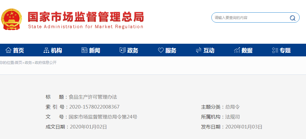 《食品生产许可管理办法》已于2019年12月23日经国家市场监督管理总局2019年第18次局务会议审议通过,现予公布,自2020年3月1日起施行。
